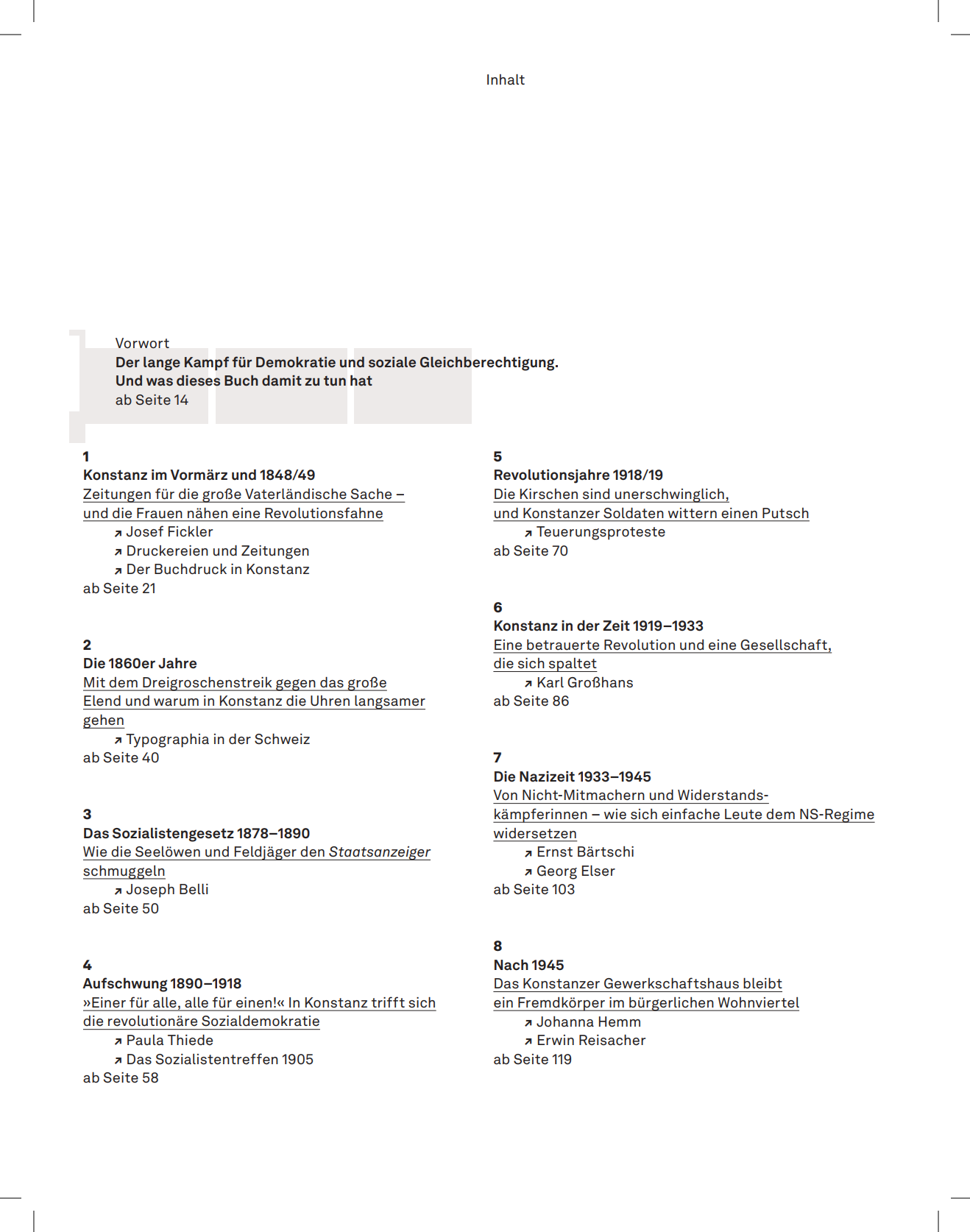 Es ging mitunter laut und widerständig zu im beschaulichen Konstanz. Denn auch am westlichen Bodensee fand die Weltgeschichte ihren Widerhall, auch hier forderten Menschen Freiheit, Demokratie und den Achtstundentag, auch hier traten sie ein für politische und soziale Rechte. Auf dem Stephansplatz verschafften sich 1848 Frauen lautstark Gehör, im Gasthaus Helvetia am Bodanplatz debattierten 1879 zornige Sozialisten das Verbot ihrer Partei. Als 1918 die Revolution ausgerufen wurde, formierte sich auch in Konstanz ein Arbeiter- und Soldatenrat, und dreizehn Jahre später flogen im Wollmatinger »Rößle« den Nazis Biergläser und Stühle um die Ohren. KonstanzerInnen demonstrierten gegen Hitler, halfen Flüchtenden in die rettende Schweiz und kämpften nach dem Krieg für Mitsprache am Arbeitsplatz – und einen freien Zugang zum Seeufer … »Druck. Machen.« versammelt Geschichten zu Konstanzer Demokratiebewegungen. Anlass ist das 150-jährige Bestehen des ver.di-Ortsvereins Medien + Kunst, der auf eine der ältesten deutschen Gewerkschaften zurückgeht: die der Buchdrucker. Und diese Geschichten zeigen: Ohne die Revolution von 1848 wären die Verhältnisse nicht liberaler geworden. Ohne die Frauenbewegung und die Revolution von 1918 wäre das allgemeine Wahlrecht nicht in Kraft getreten. Ohne Gewerkschaften hätten wir noch den Vierzehnstundentag. Der solidarische Einsatz für gute Lebens- und Arbeitsbedingungen lohnt sich also. Auch in Konstanz.