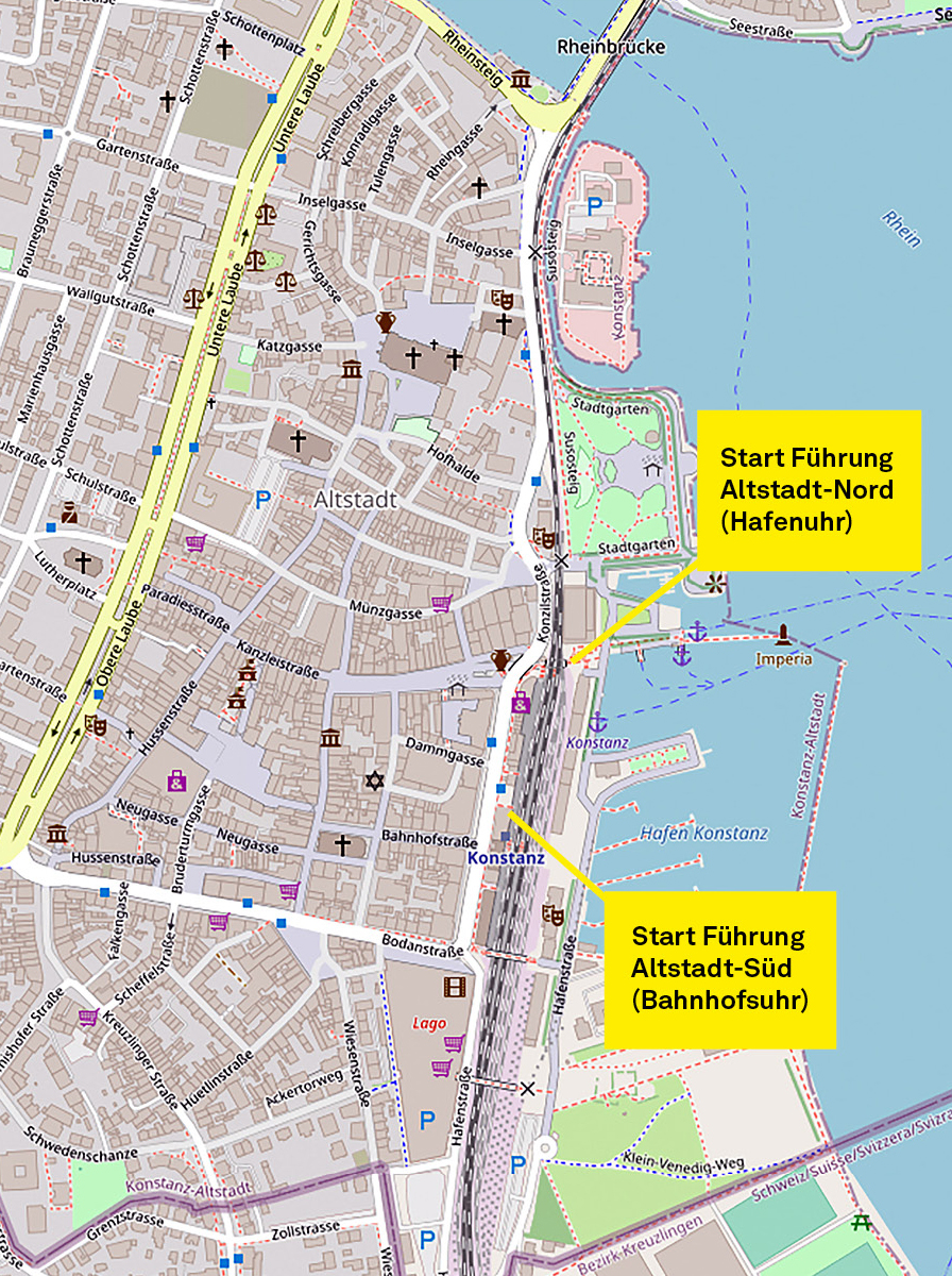 Der Rundgang führt vom Bahnhof über die Marktstätte durch die Hussenstraße und über den Bodanplatz zur Schweizer Grenze und weiter ins Paradies.